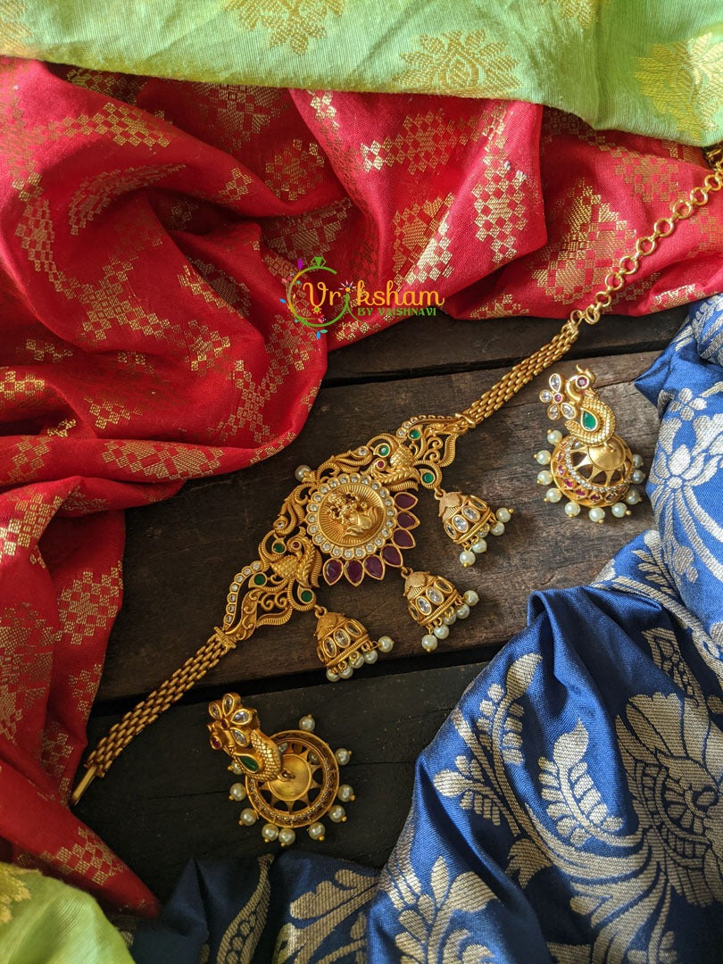 Simple Jhumka style Lakshmi High Neck Choker is a gold look alike choker. This choker has a center lakshmi design, with jhumka syle drops at a bottom giving it a very beautiful design.