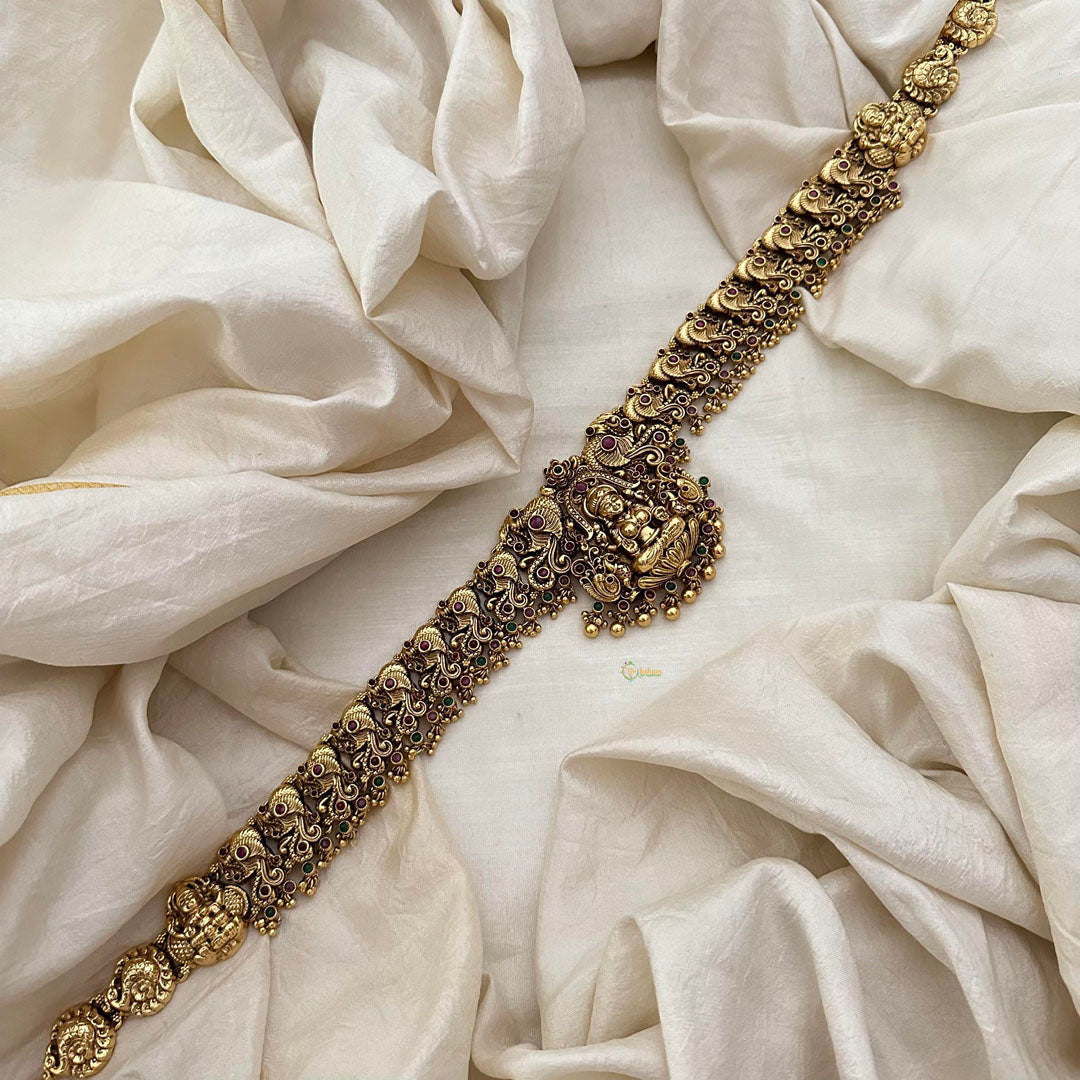 Indulge in luxury with our Simple Lakshmi Pendant Bridal Hip Chain-Golden Bead. Featuring a delicate peacock chain and a stunning Lakshmi pendant, this hip chain exudes elegance and sophistication. Finely crafted with golden beads, it's the perfect accessory for a bride on her special day. Bring an aura of opulence to your wedding ensemble with this exquisite piece.