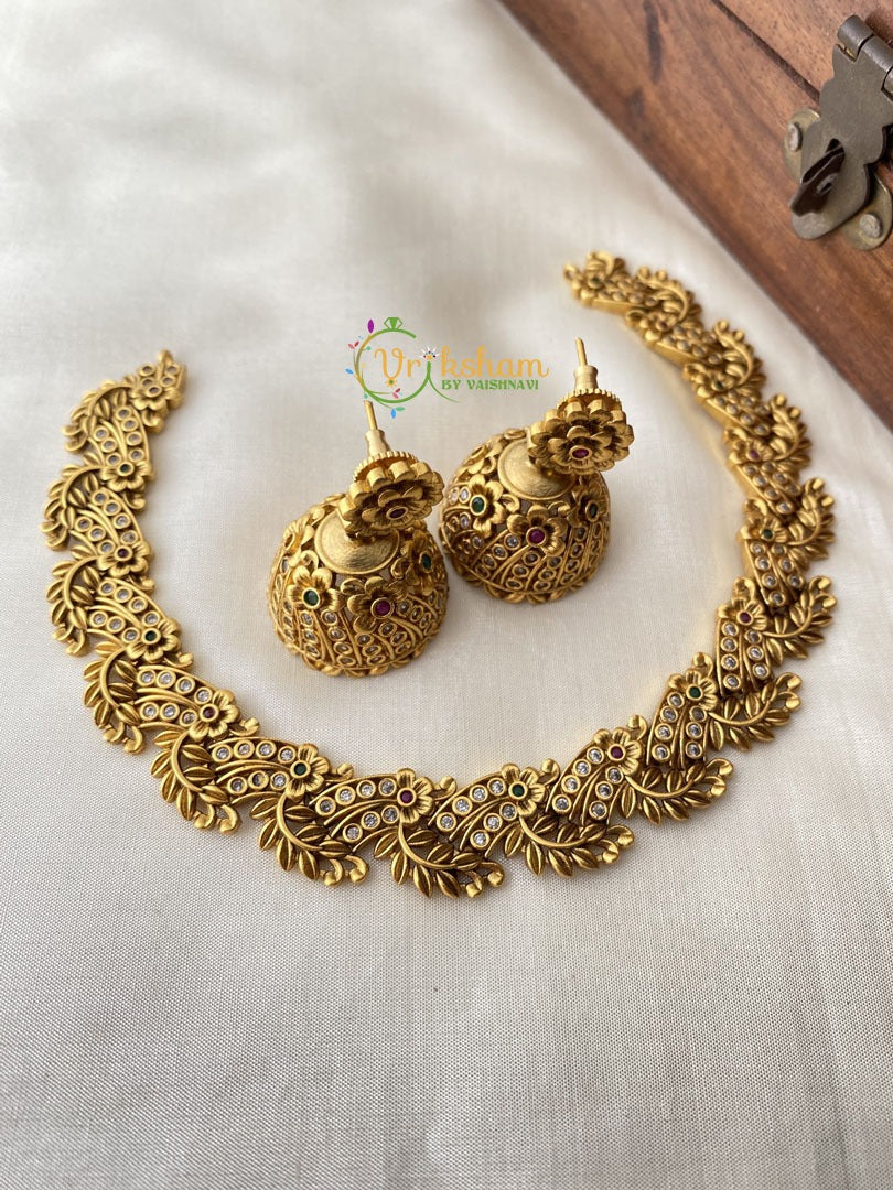 Simple Leaf and Floral Choker-Simple Short Neckpiece with floral pattern and small leafy structure ; comes with matching jhumkas.