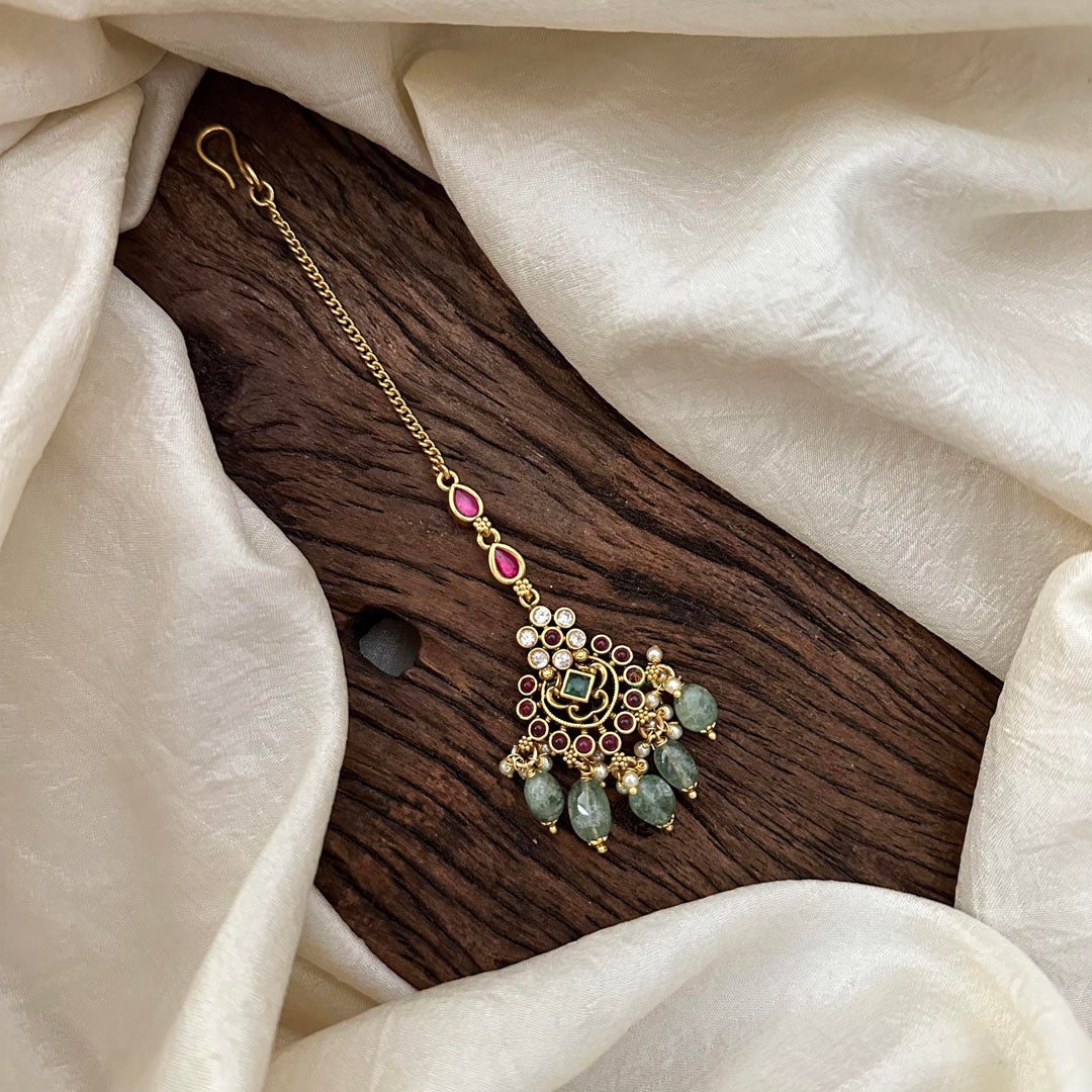 Elevate your look with our exclusive Simple Maang Tikka featuring stunning aqua green beads and delicate pearls. Perfect for adding a touch of elegance and sophistication to any outfit. Experience the luxury of this timeless piece.