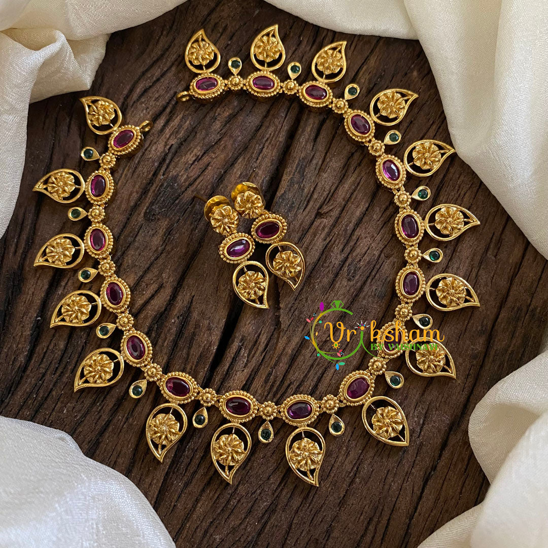 Elegant Simple Maanga Short Neckpiece- small pendant maanga neckpiece ;Ad stone; comes with matching earrings.