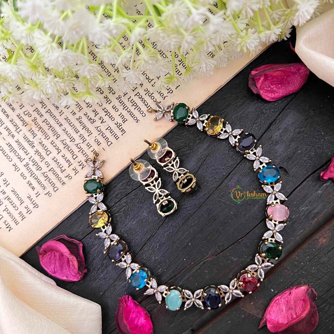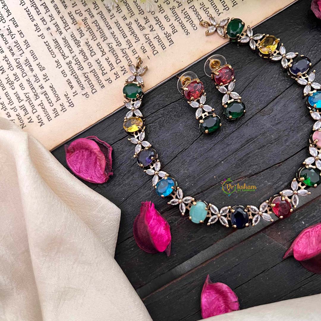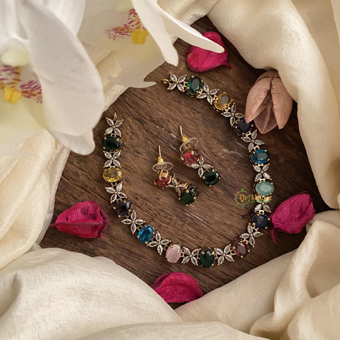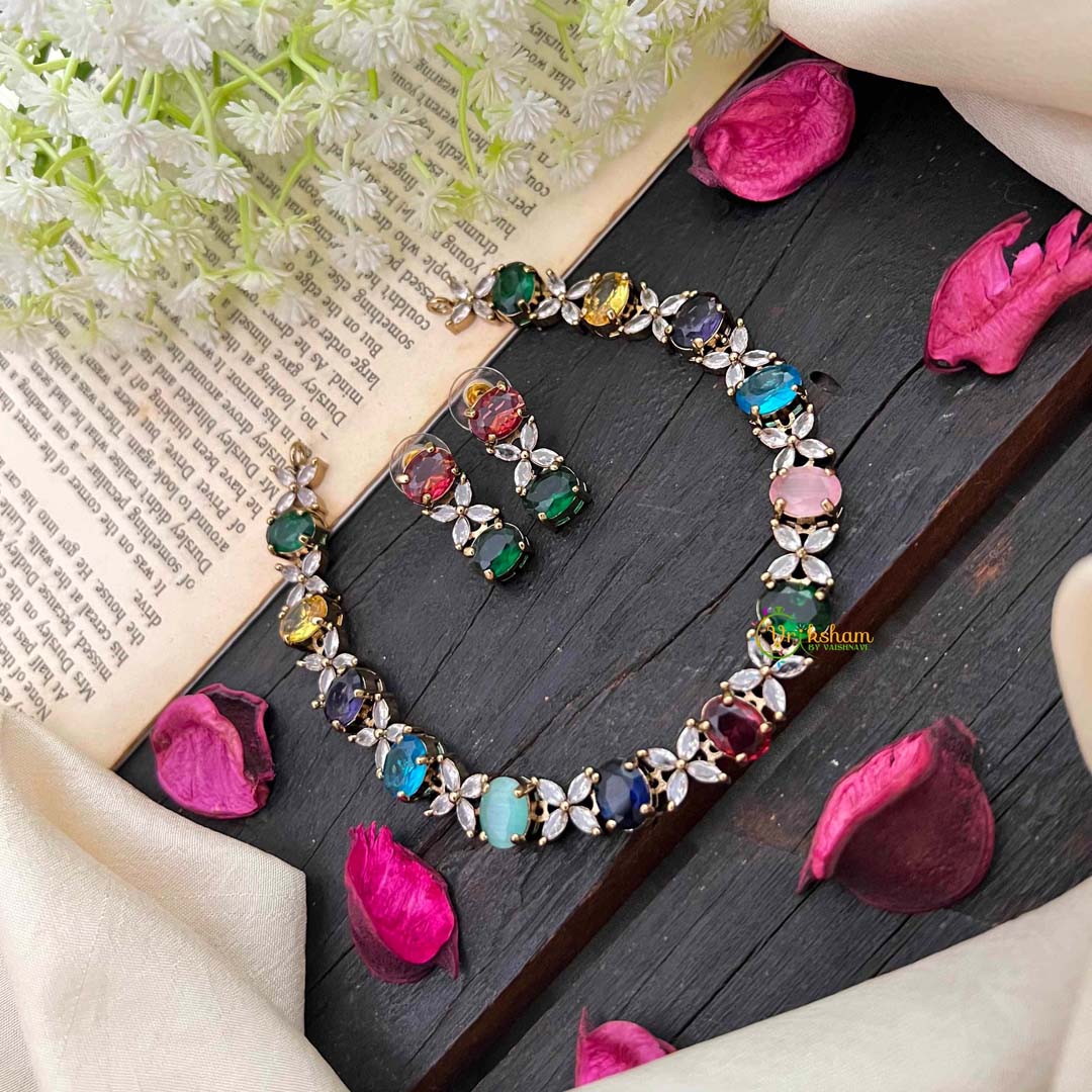 Indulge in timeless elegance with our Simple Navrathna Victorian Diamond Neckpiece. This exquisite piece features a stunning combination of intricate Victorian design and dazzling diamonds, bringing the perfect touch of luxury to any outfit. Elevate your style and make a statement with this exclusive and sophisticated neckpiece.