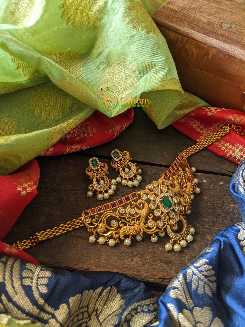 Simple Peacock Pearl Embalished High Neck Choker is a gold look alike choker. This choker has a double peacock design with a center piece stone and it comes with earrings.