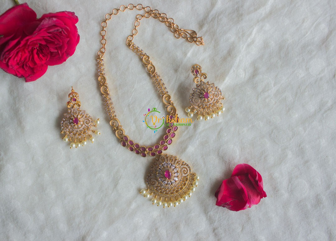 Simple Pendant Neckpiece -AD Stone White and pink neckpiece, studded ear hangings similar to the pendant.
