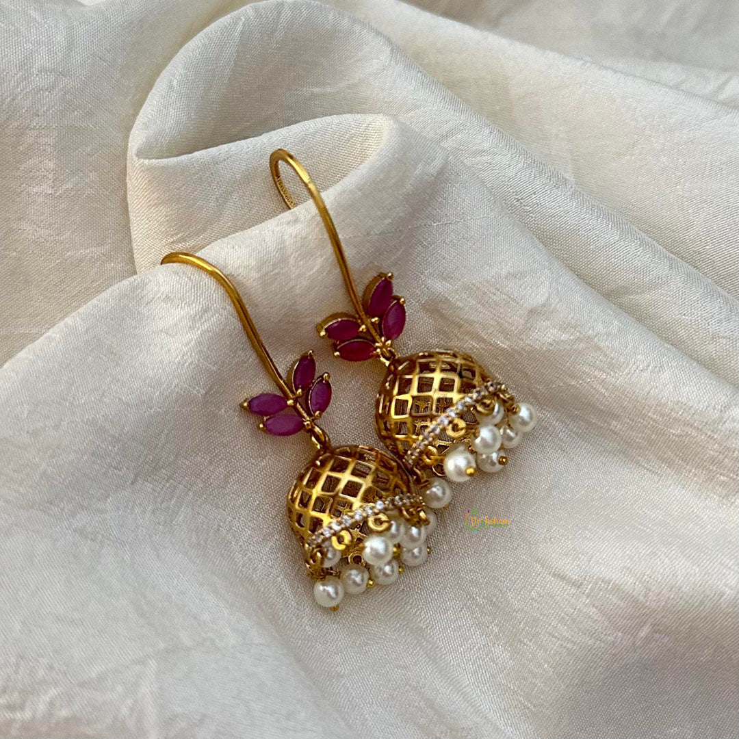 Complete your elegant look with our Simple Red AD Stone Jhumkas-Leaf-Pearls. Adorned with sparkling AD stones and delicate pearl accents, these jhumkas will add a touch of sophistication to any outfit. Perfect for any occasion, these jhumkas are a must-have in your jewelry collection.