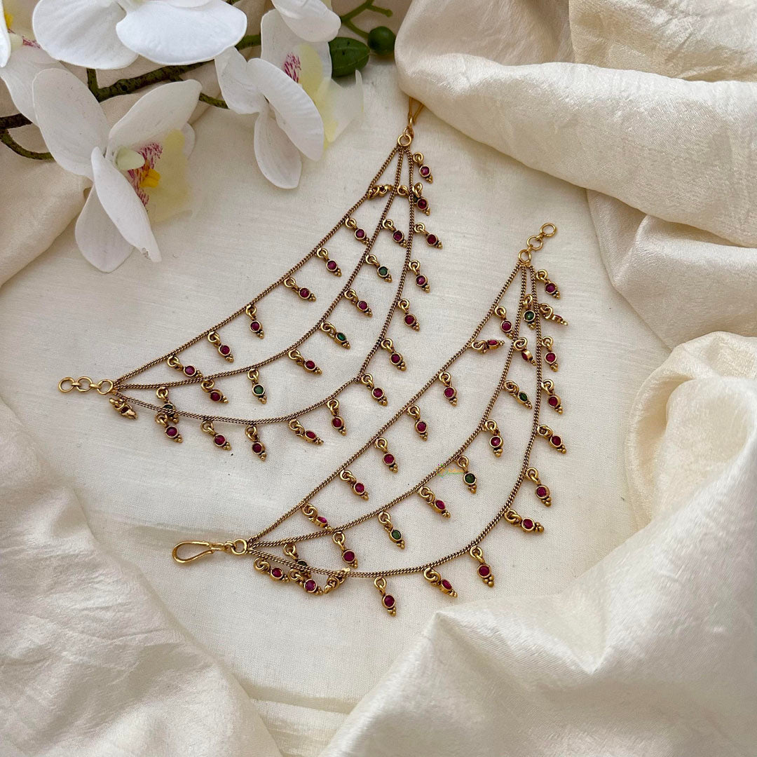 Elevate your style with our Simple Red Green AD Stone 3 Layer Maatil-Ear Chain. Three layers of sparkling stones in a striking red and green color combination make for a truly unique and eye-catching ear chain. Add a touch of luxury to any outfit with this exquisite piece.