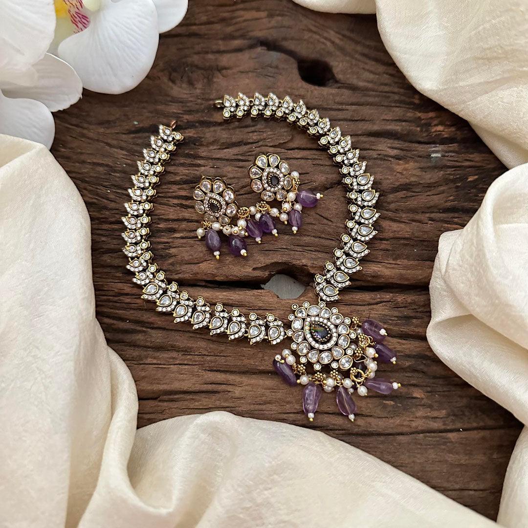 Elevate your elegance with our Simple Victorian Diamond Short Neckpiece. This premium piece features a stunning purple bead and comes with matching earrings, exuding sophistication and exclusivity. Accentuate your style with a touch of luxury and grace.