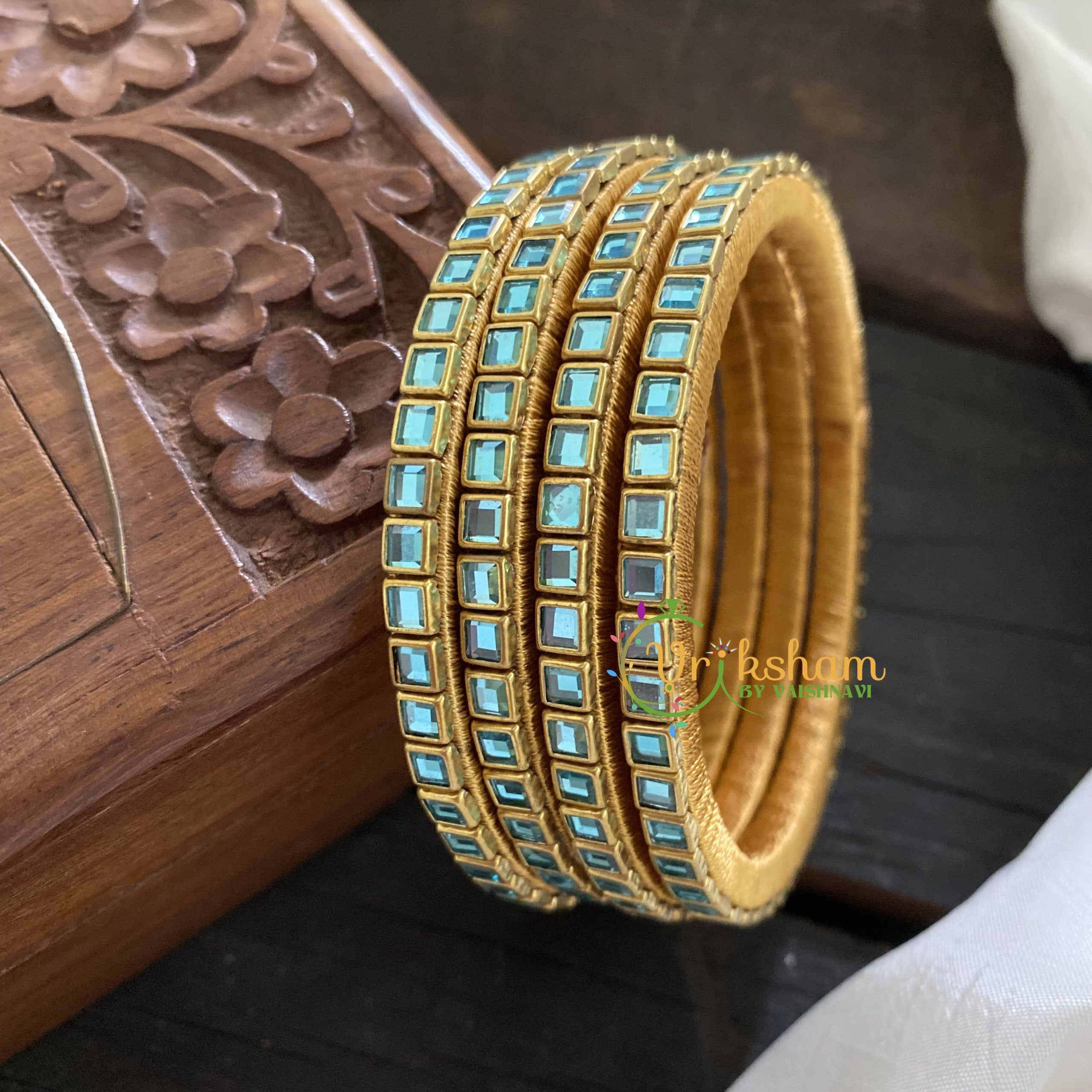Single Line Kundan Bangle-Glossy-Blue- Sandal Silk Thread Bangles- kundan stone festive bangles , Comes as 4 bangles only.