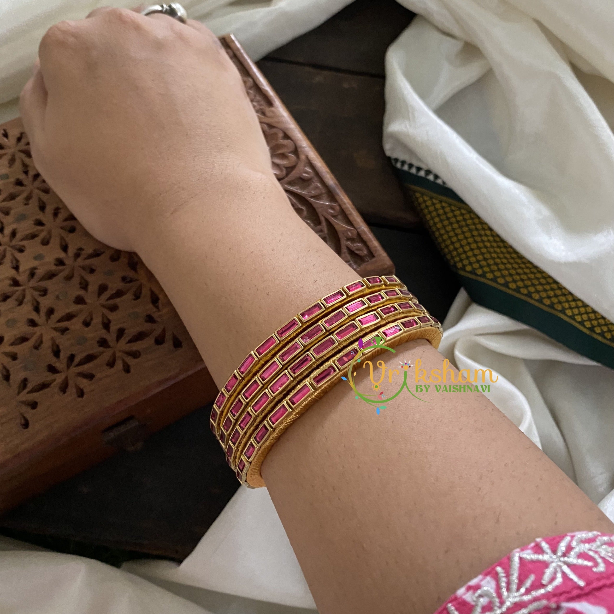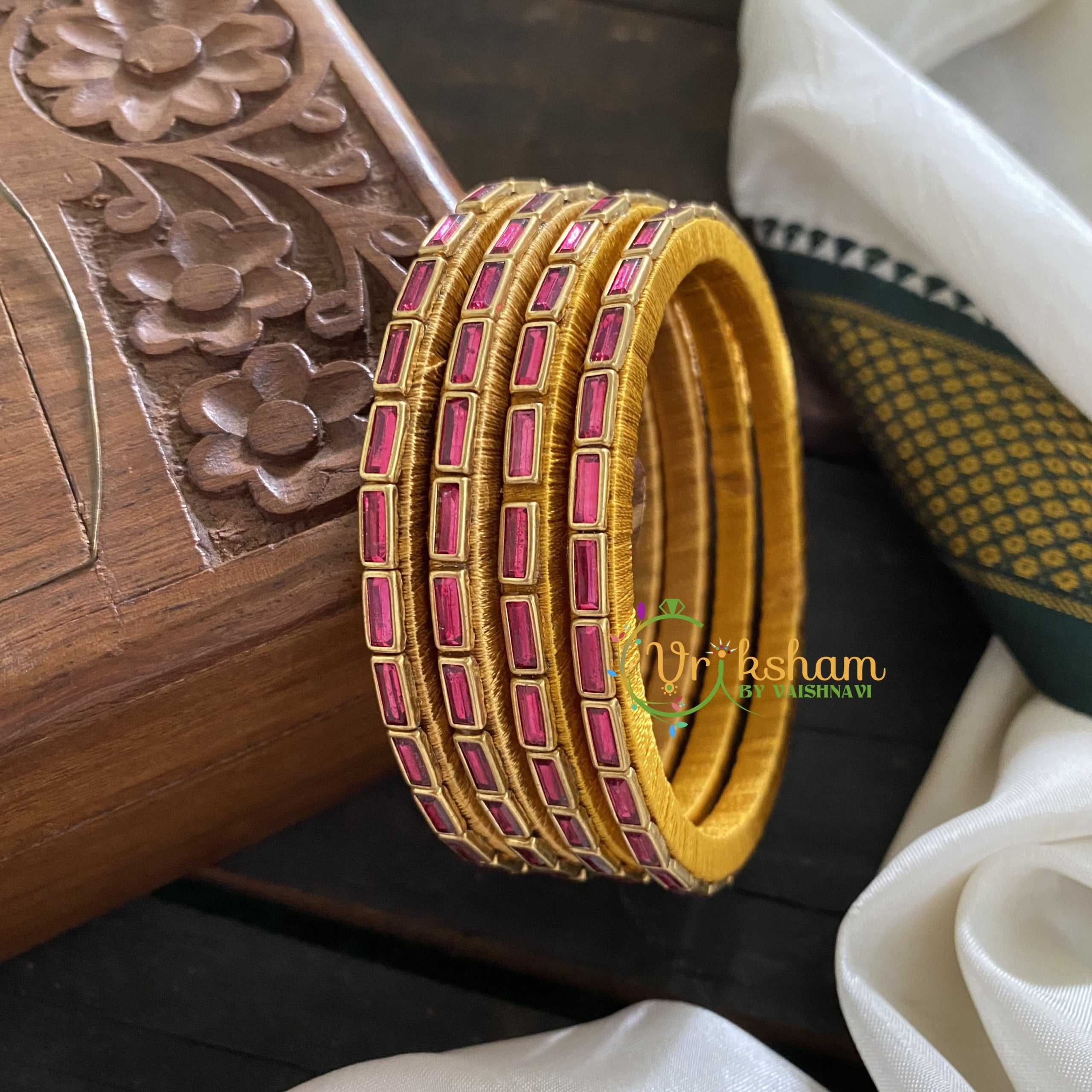 Single Line Kundan Bangle-Lines-Pink red-Opaque- Sandal Silk Thread Bangles- kundan stone festive bangles , Comes as 4 bangles only.