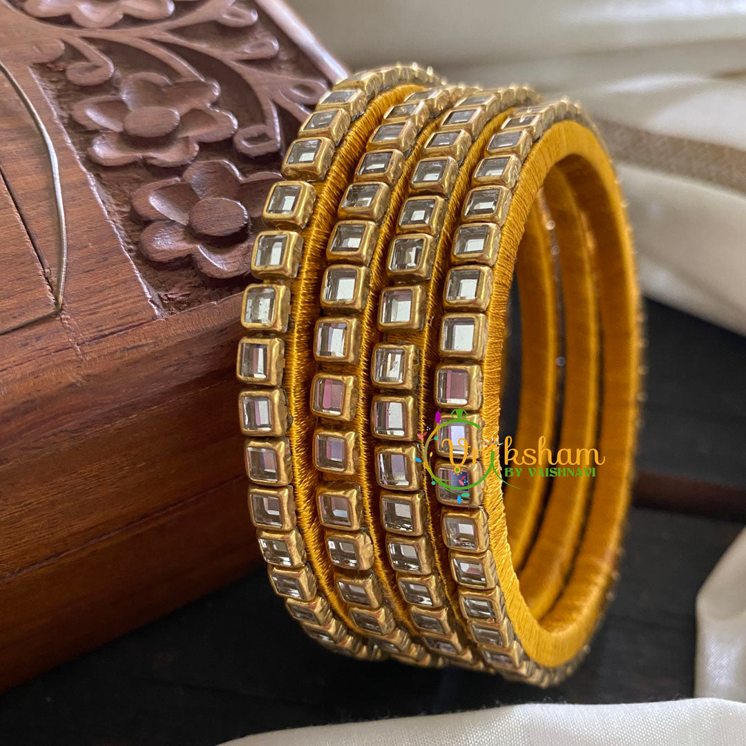 Single Line White Kundan Bangle-Glossy- Yellow Silk Thread Bangles-WHITE kundan stone festive bangles , Comes as 4 bangles only.