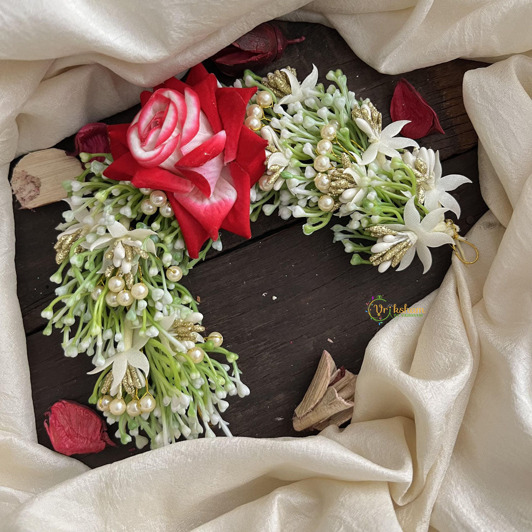 Single Reddish Pink Rose Veni with Gold Beads - Tear drop beads - Flower Accessory- veni– Tie around 'U' shaped type veni hair accessory.