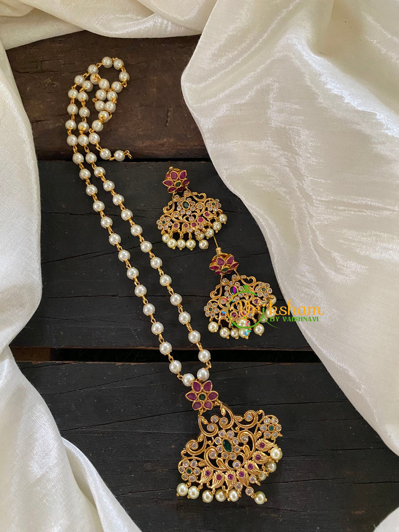 Single strand pearl Pendant Chain - single strand round pearl chain with centre pendant - gold look alike polish.