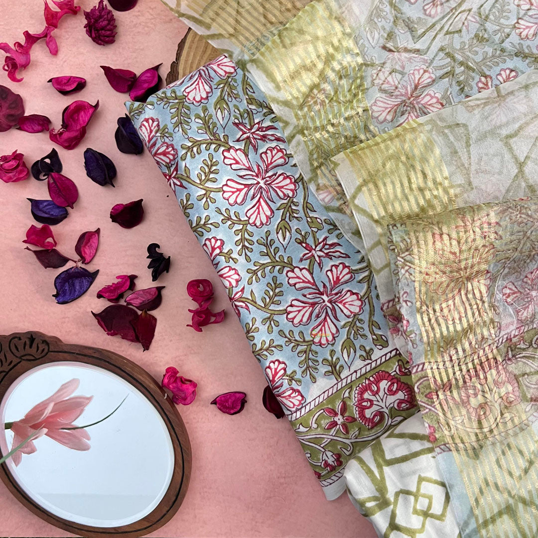 Elevate your style with our Sky Blue Cotton Suit Material Set! Bagru printed with a striking contrast color, this set is sure to make a statement. Made with 100% cotton, it offers both comfort and style. Includes a matching dupatta for a complete and polished look.