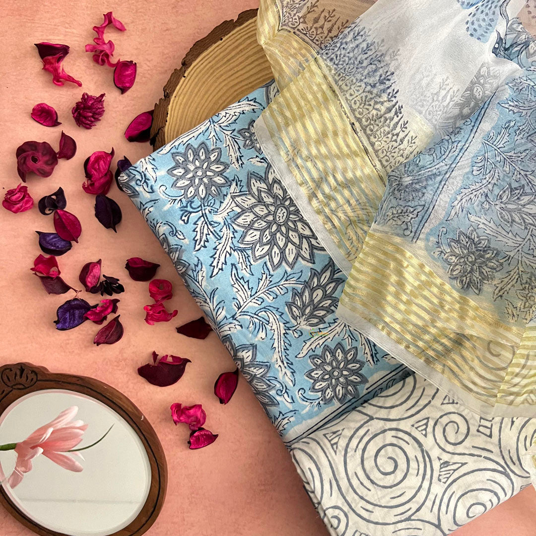 Experience the timeless beauty of hand block printing! This Sky Blue Cotton Suit Material Set is the epitome of elegance and style. Made from the finest cotton, it features a delicate bagru print design and comes with a crisp white bottom and a complementary dupatta. Elevate your wardrobe with this exquisite set today!