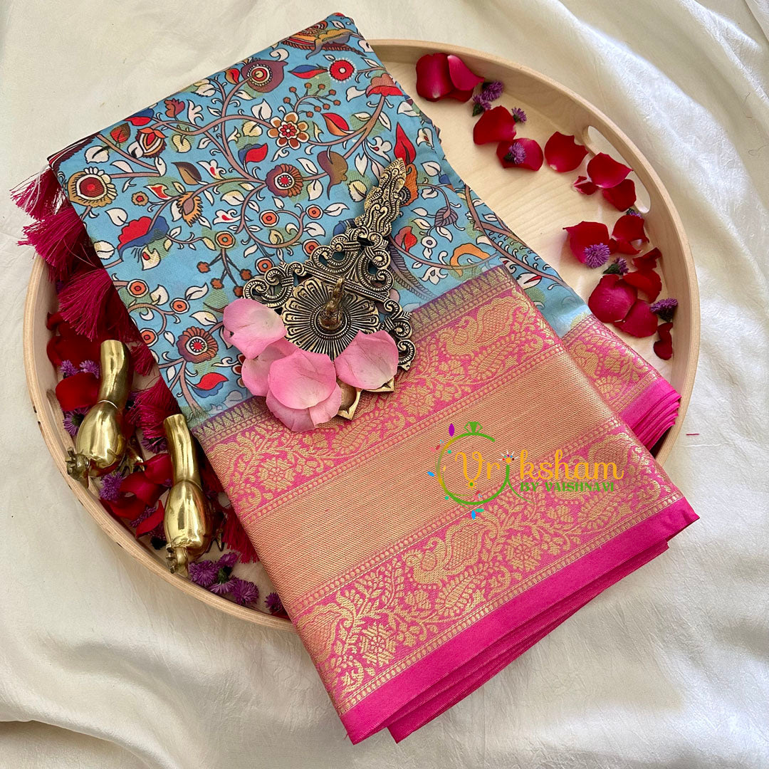Sky Blue Kalamkari Saree –Semi Soft Silk Saree- Festive wear saree – kalamkari print work throughout the saree; comes with Blouse attached. Two side traditional kanchi border.