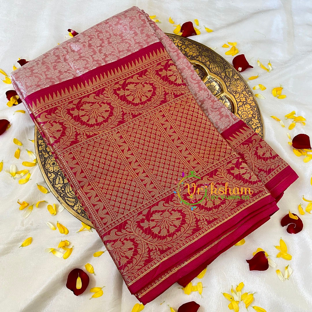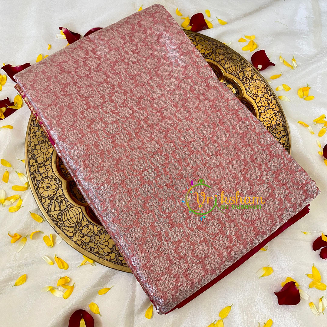 Soft Maroon Semi Benarasi Saree Festive wear saree –self work throughout the saree; comes with Blouse attached. Contrast two side border and pallu - one side bigger border.