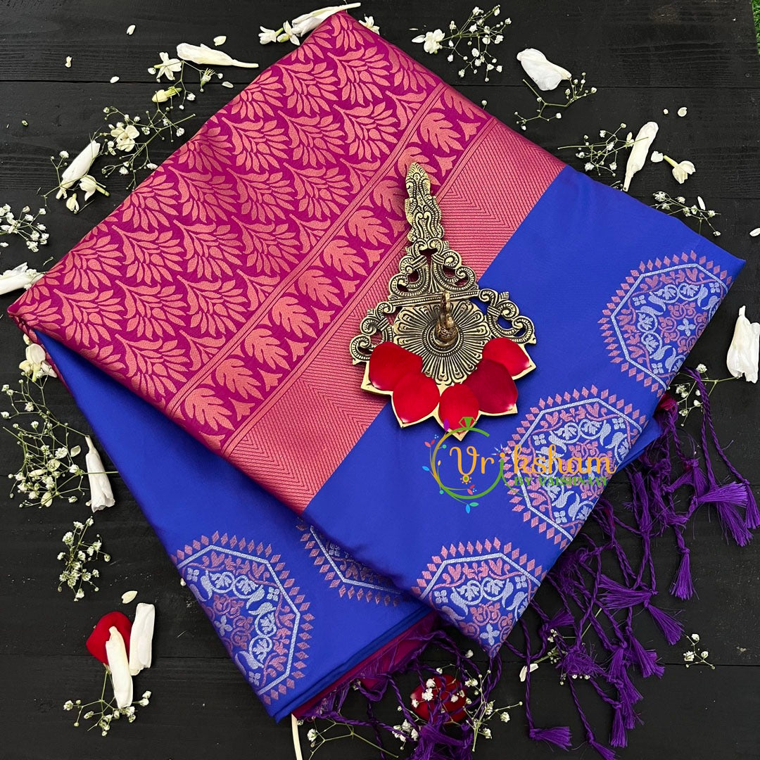 Ink Blue with Pink Pallu Soft Silk Saree- Festive wear saree – Pattern throughout the saree; comes with Blouse attached. Borderless Saree.