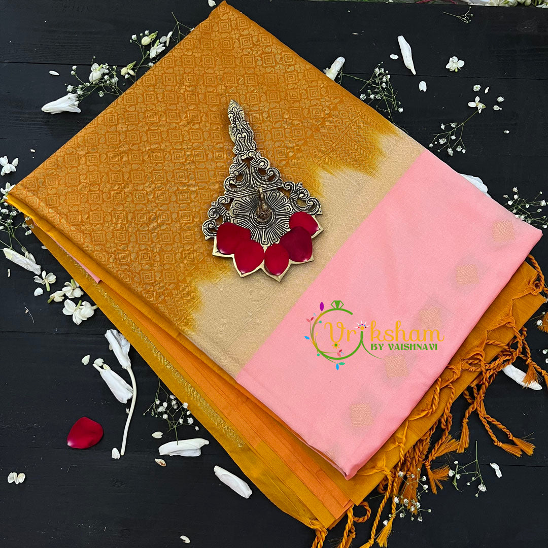 Baby Pink with Yellow Border Soft Silk Saree- Festive wear saree – Pattern throughout the saree; comes with Blouse attached.