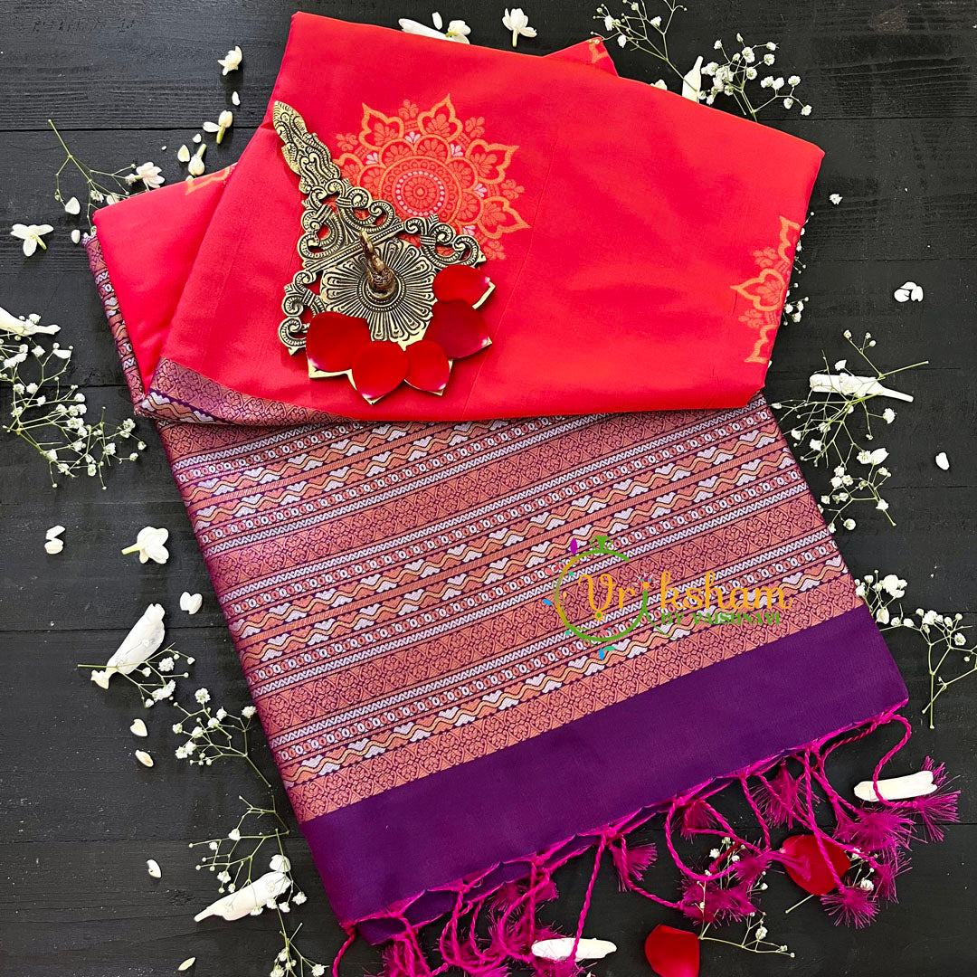 Peachy Red with Purple Pallu Soft Silk Saree- Festive wear saree – Pattern throughout the saree; comes with Blouse attached. Borderless Saree.