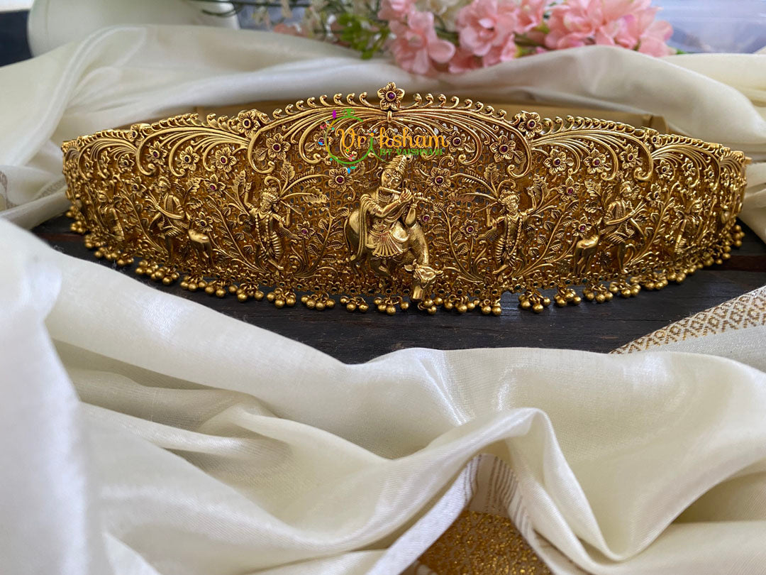 Premium Sri Krishna and His Forms -Temple Hipbelt- with red and green ad stone (imitations ) studded and floral pattern bridal temple hipblet.