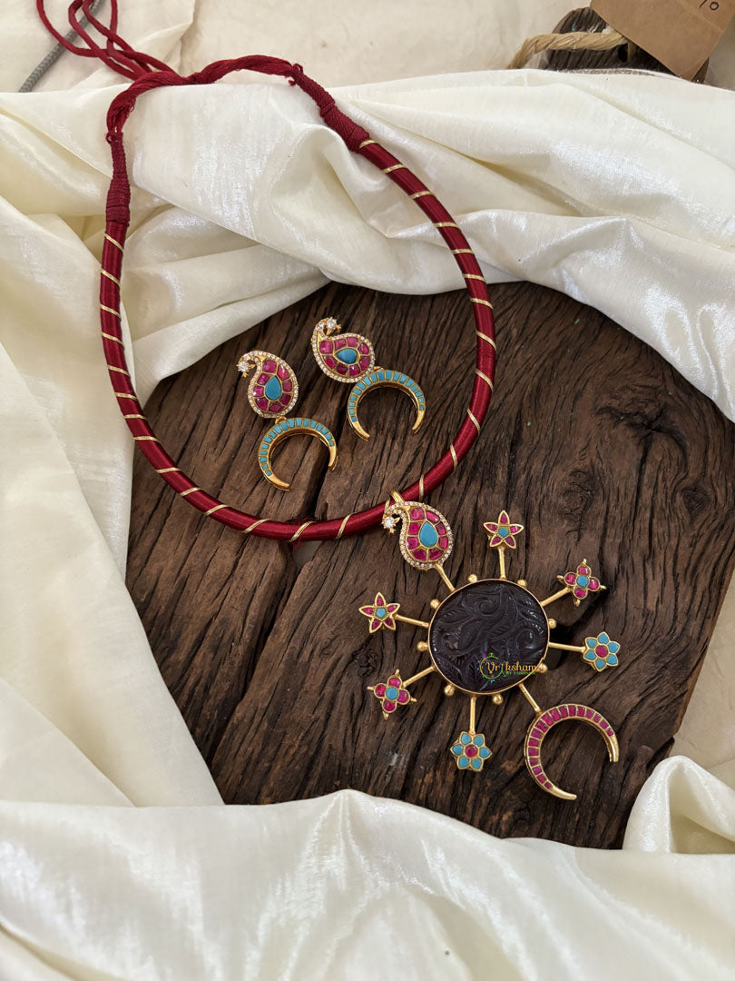 Statement Dual Tone Jadau Kundan Dokri Rope Neckpiece –semi precious kundan stones jadau work designer pendant on a dokri rope neckpiece.