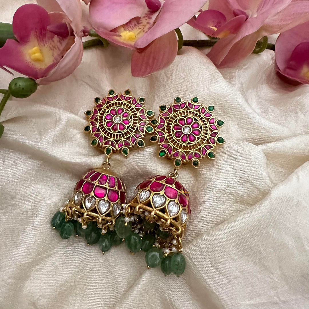 Elevate your look with our stunning Statement Jadau Kundan Jhumkas! Featuring vibrant Aqua Green Beads and delicate Pearls, these jhumkas add a touch of elegance and glamour to any outfit. Handcrafted with precision and care, they are a must-have for any jewelry collection. Don't miss out on this luxurious accessory! The back screw design ensures a secure and comfortable fit.