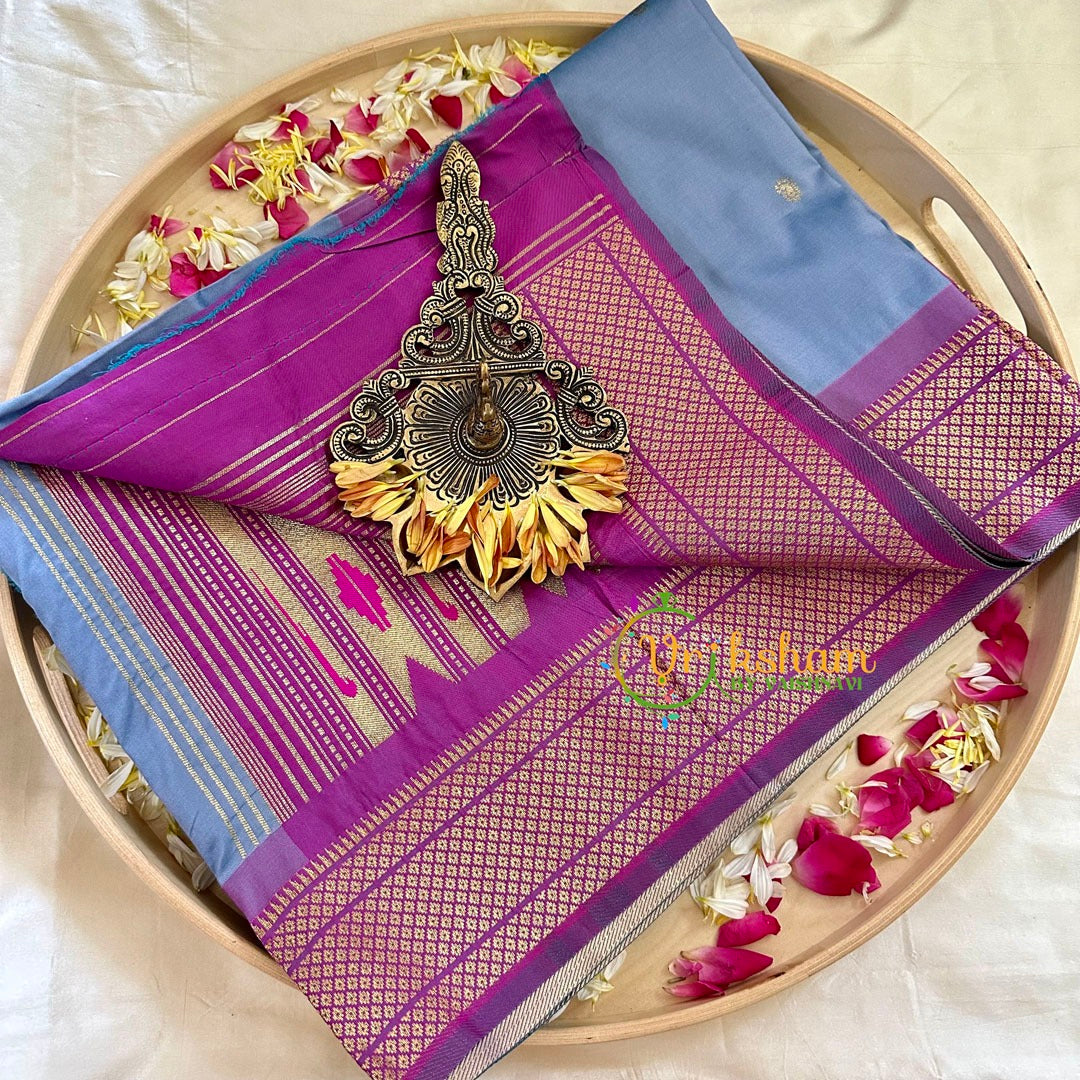 Steel Blue Semi Silk Saree with Purple Border – Festive wear saree – Butta Pattern throughout the saree; comes with Blouse attached. Traditional border. Power loomed saree.