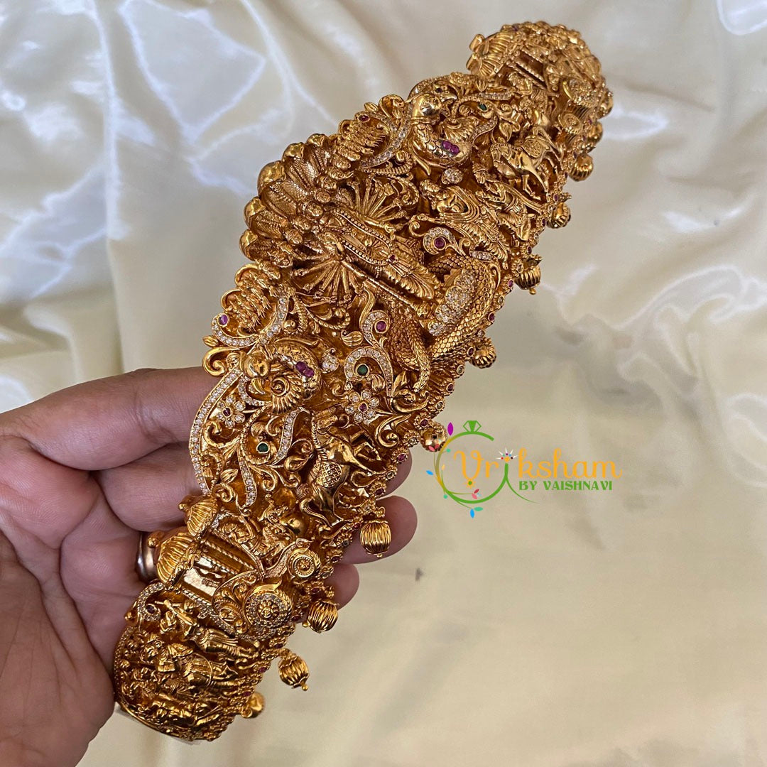 Premium AD Stone Dasavathar Bridal Hipbelt with green and red imitation stone and floral pattern. Gold Bead finish pattern.