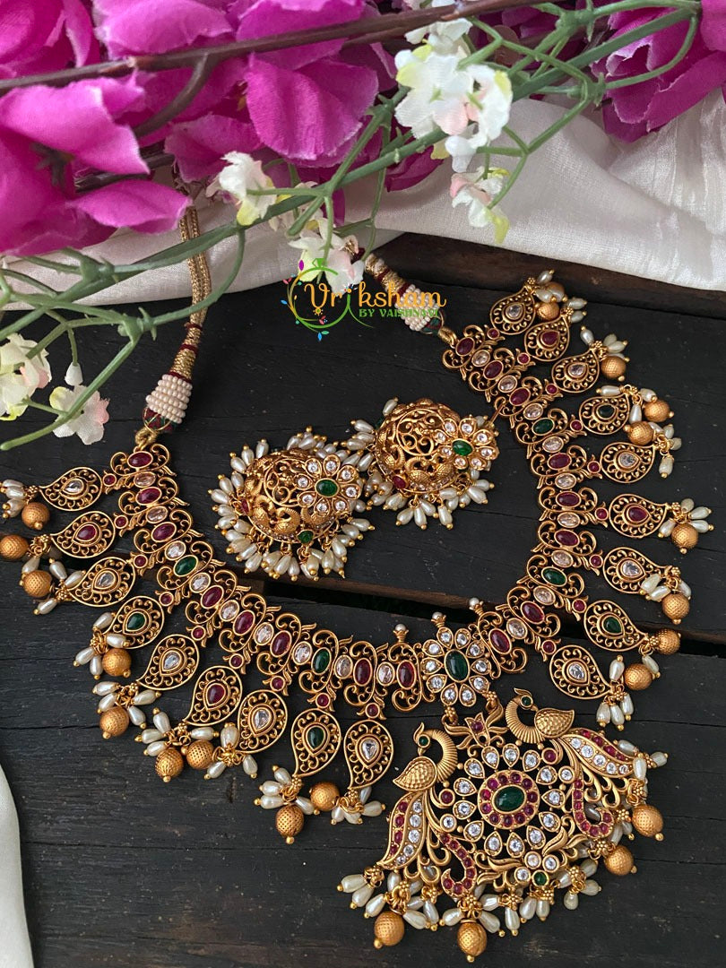 Premium AD Stone Guttapusalu Short Neckpiece -Paisley pattern and peacock pendant with rice pearl guttapusalu finish; comes with pair of similar earrings