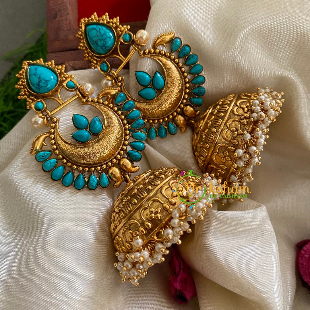 Premium Stone Traditional Jumbo Jhumkas-Turquoise- imitation Stone studded jhumkas of premium quality and pearl finish.