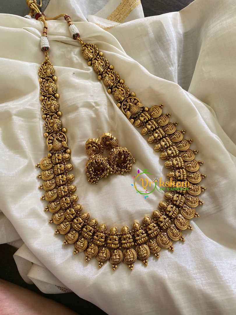 Premium Coin Style Lakshmi Haram -Temple Haram -Lakshmi idols arranged in linear fashion , comes with matching jhumkas.