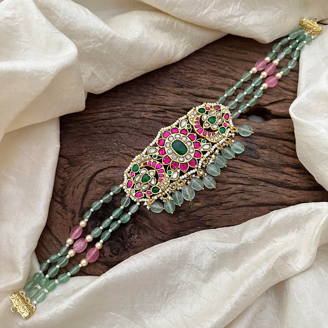 Elevate your style with our Stylish 3 Layer Jadau Kundan Choker. Adorned with pastel pink and green beads, this choker adds a touch of elegance to any outfit. Handcrafted with intricate details, it's the perfect statement piece for any occasion. Make heads turn with this stunning accessory!