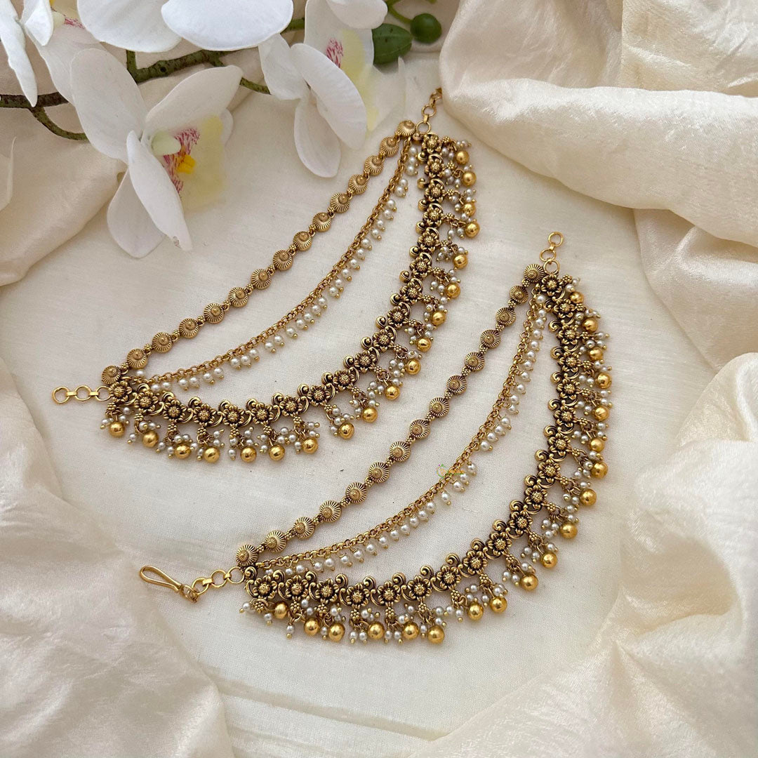 Add a touch of elegance with our Stylish 3 Layer Pearl & Gold Bead Maatil-Ear Chain, featuring layers of lustrous pearls and delicate gold beads. This exclusive accessory will elevate any outfit and create a sophisticated look. Perfect for special occasions or as a luxurious gift.