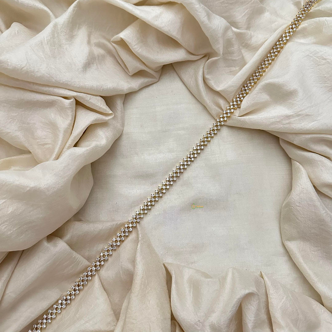 Add a touch of elegance to your outfit with our Stylish Ad Stone Ganga Jamuna Thin Hip Chain. Crafted with white American diamonds, this hip chain features a unique Ganga jamuna style, adding a sophisticated touch to your look. Elevate your style with this luxurious accessory.