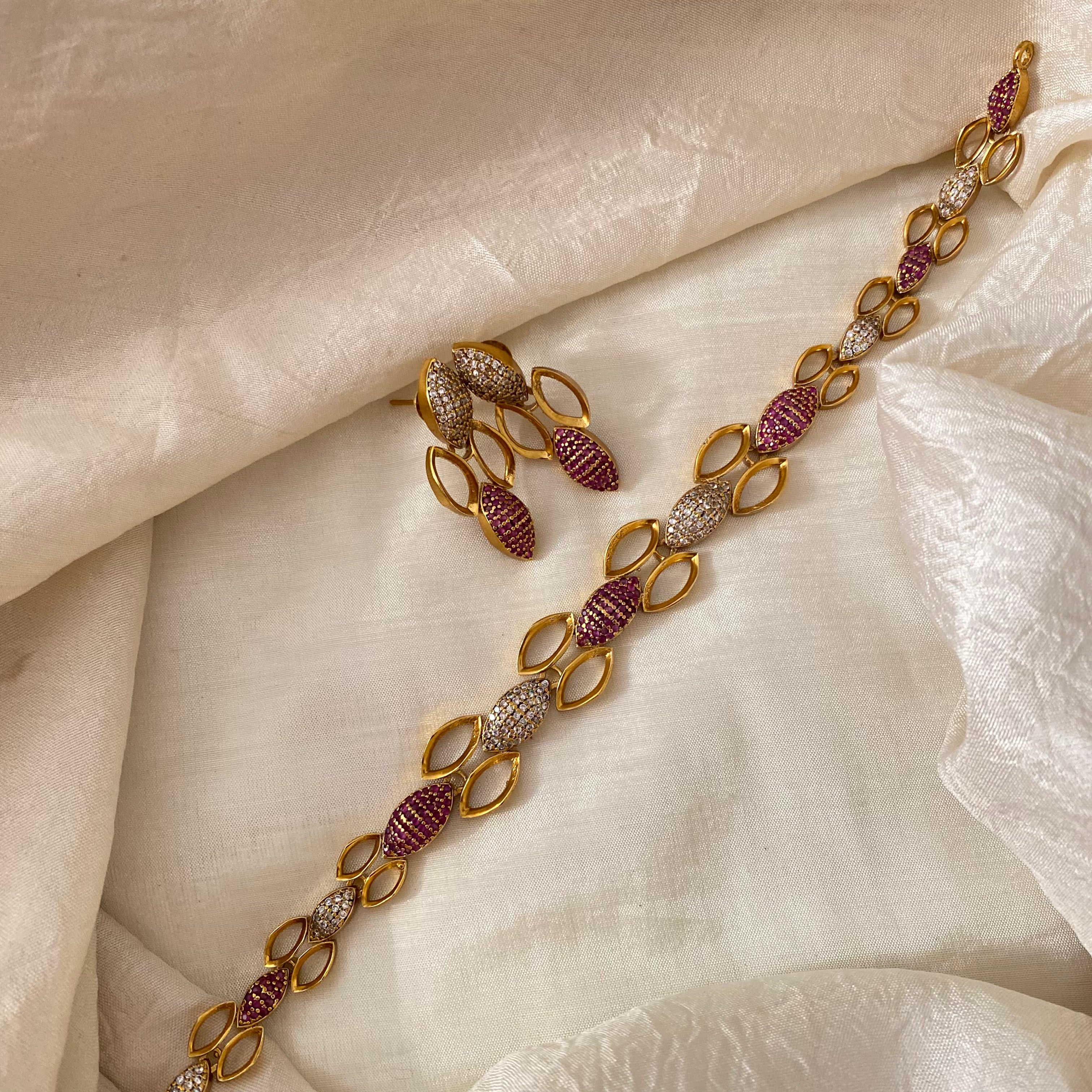 Stylish AD Stone Short Neckpiece-Red White- Premium gold look alike AD stone patterned short neckpiece with earrings.