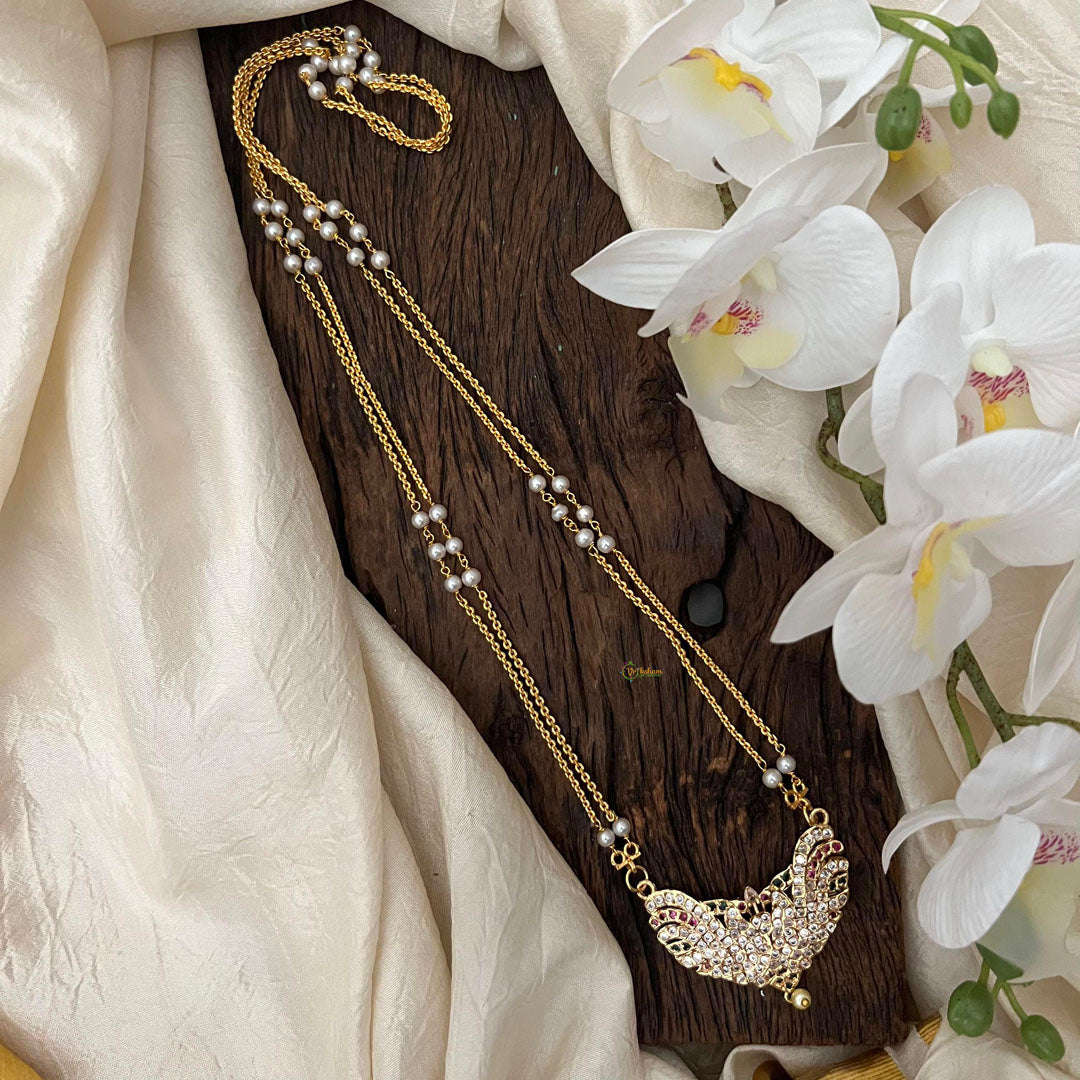 Elevate your style with our Stylish AD Stone Twin Bird Pendant Chain featuring a delicate pearl. The twin bird design represents freedom and beauty, while the AD stones add a touch of glamour. This luxurious accessory is perfect for the fashion-forward individual seeking a unique and sophisticated look.