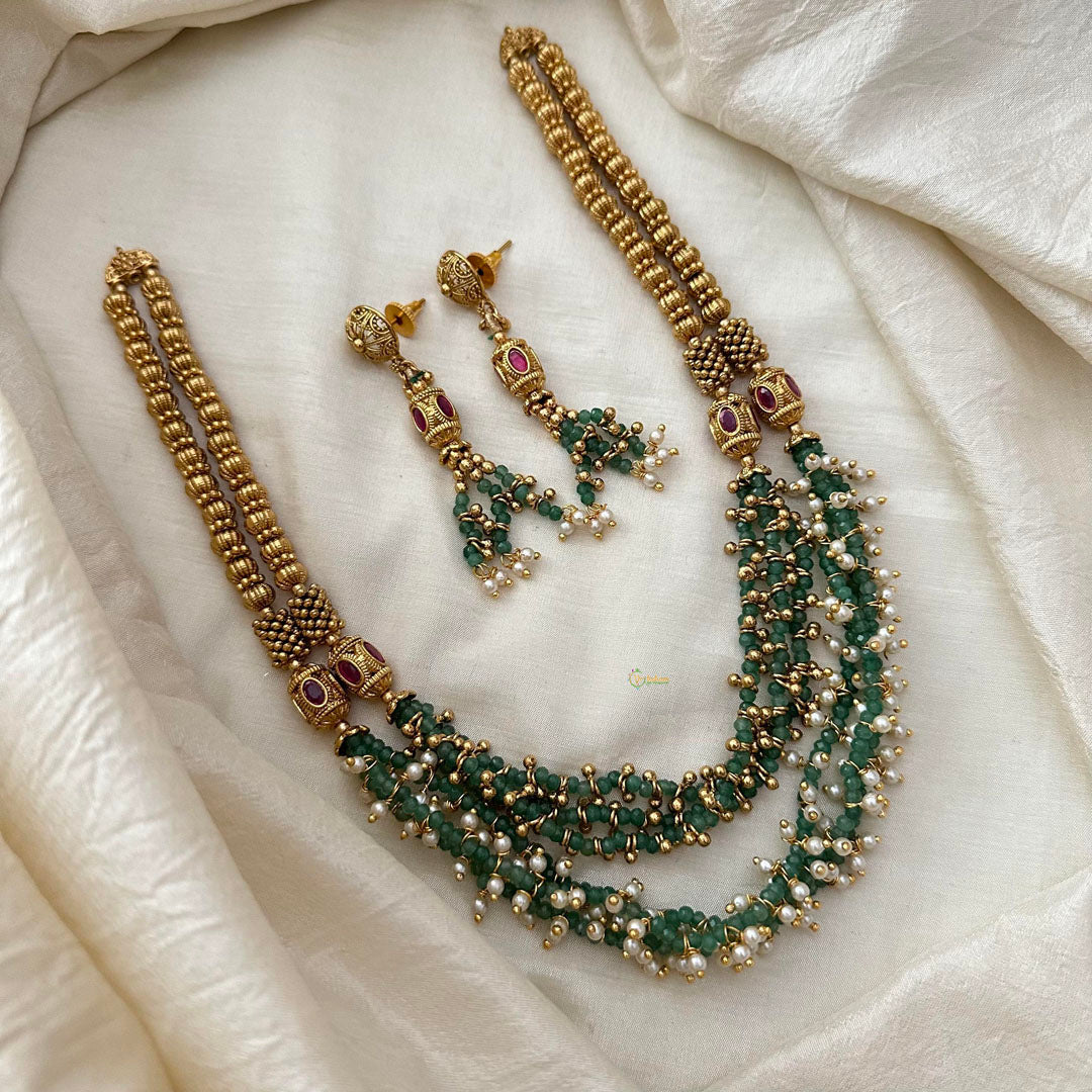 Transform your look with our luxurious Stylish Beaded Layered Malai set. The beautiful malai features intricate green, pearl, and golden beads, creating a layered and elegant design. Complete your look with the matching earrings for a touch of sophistication. Elevate your style today.
