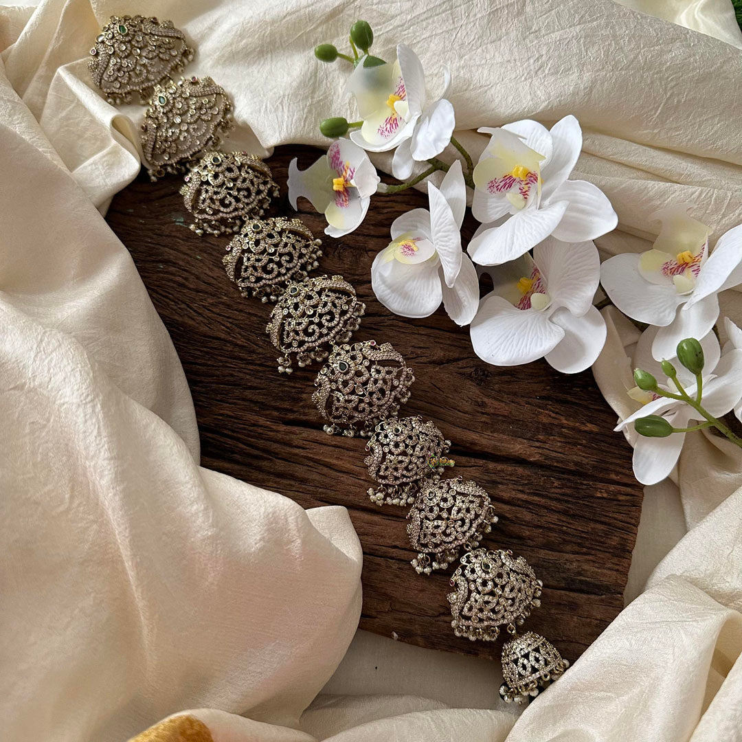 Elevate your bridal ensemble with our exquisite Stylish Dual Parrot Victorian Diamond Bridal Jada Billai-Green-Pearl-VV1658. Featuring a long jada billai with 9 pendants adorned with a striking green stone and dazzling white stones, this piece is a true masterpiece of sophistication and exclusivity. Add a touch of elegance to your special day with this luxurious accessory.
