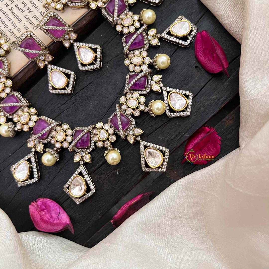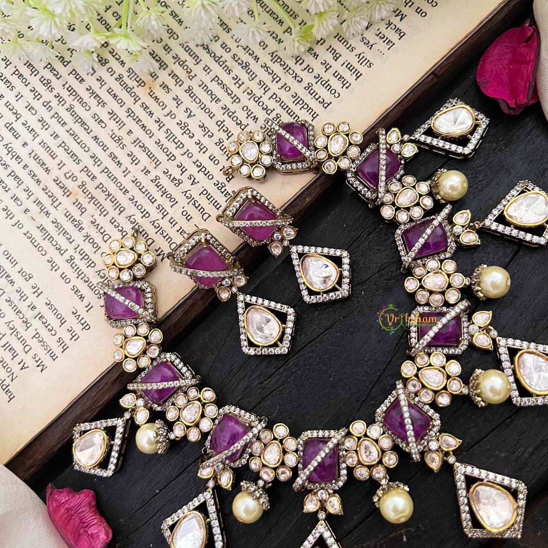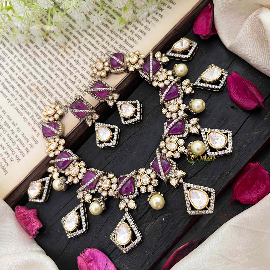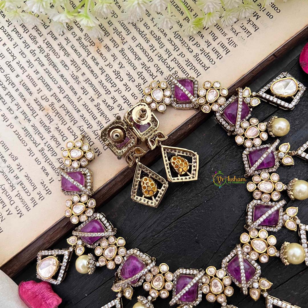 Elevate your jewelry collection with our Stylish Floral Purple Victorian Diamond Haram. This exclusive piece features intricate floral designs and sparkling purple and diamond accents. Embrace luxury and elegance with this unique and timeless addition to your wardrobe.