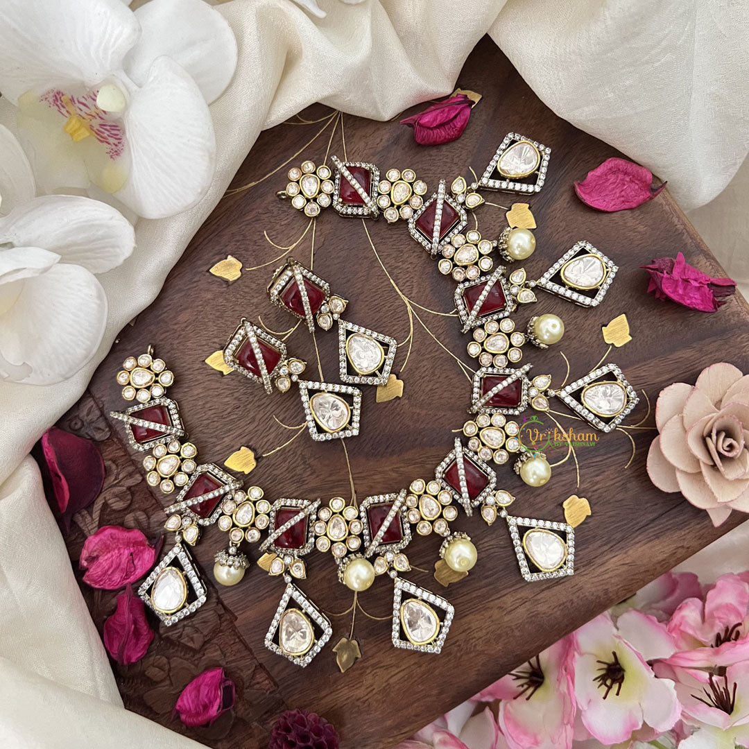 Elevate your jewelry collection with our Stylish Floral Ruby Red Victorian Diamond Haram. This exclusive piece features intricate floral designs and sparkling ruby red and diamond accents. Embrace luxury and elegance with this unique and timeless addition to your wardrobe.