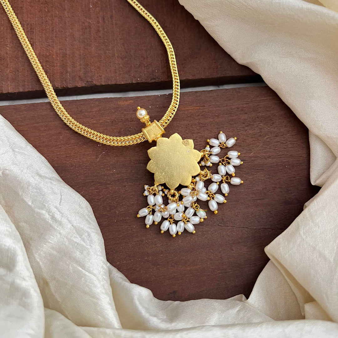 Enhance your elegance with our exquisite Stylish Jadau Kundan Flower Pendant Chain. The intricate rice pearl and Kundan design adds a touch of sophistication to any outfit. Make a statement with this premium piece that exudes luxury and exclusivity.