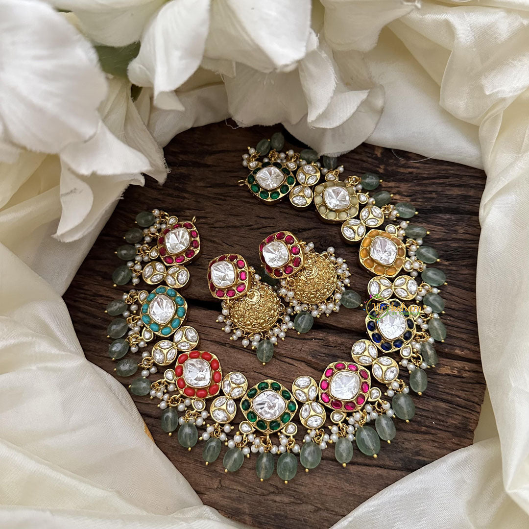 Indulge in luxury with our exquisite Stylish Navrathna Jadau Kundan Choker. This choker features an elegant aqua green bead, adding a touch of sophistication to any outfit. The intricate Navrathna and Kundan detailing exudes opulence and exclusivity. Elevate your style and make a statement with this one-of-a-kind piece.