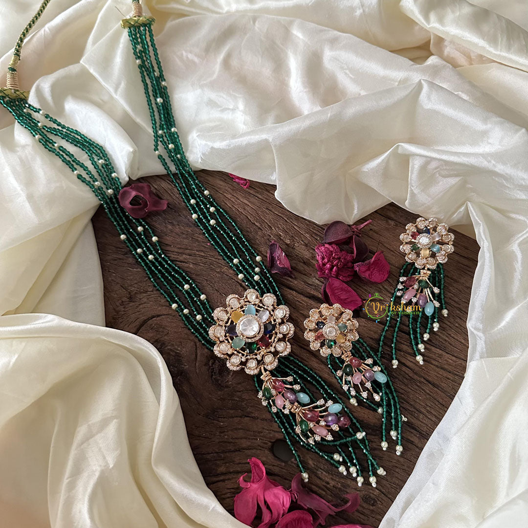 Experience the ultimate luxury with our Stylish Navrathna Layered Victorian Diamond Floral Neckpiece. Adorned with a green bead, this exquisite piece boasts intricate floral designs exuding elegance and sophistication. Channel your inner royalty with this stunning statement necklace.