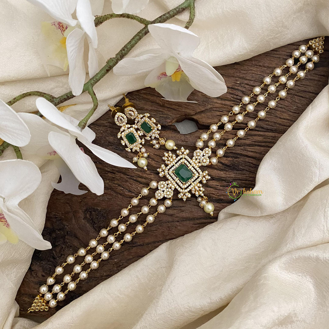 Stylish Pearl Layered AD Stone Choker-Green-G15176