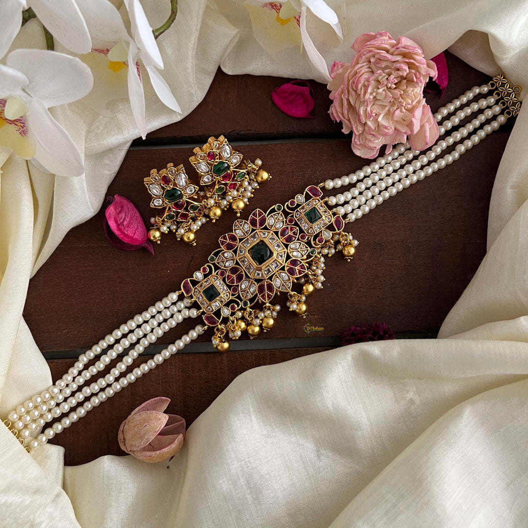 Elevate your style with our exquisite Stylish Pearl Layered AD Stone High Neck Choker. Expertly crafted with delicate pearls and sparkling AD stones, this choker exudes timeless elegance. Perfect for special occasions or adding a touch of sophistication to your everyday look.