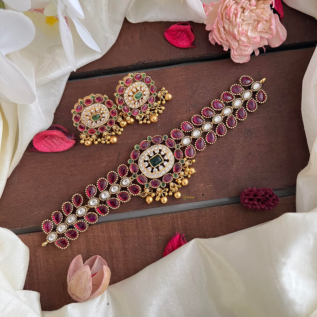 Embrace sophistication with this exquisite Stylish Red Green AD Stone High Neck Choker. Boasting intricate gold beaded details, this piece will add a touch of luxury to any ensemble. Elevate your style with the perfect blend of color and elegance.