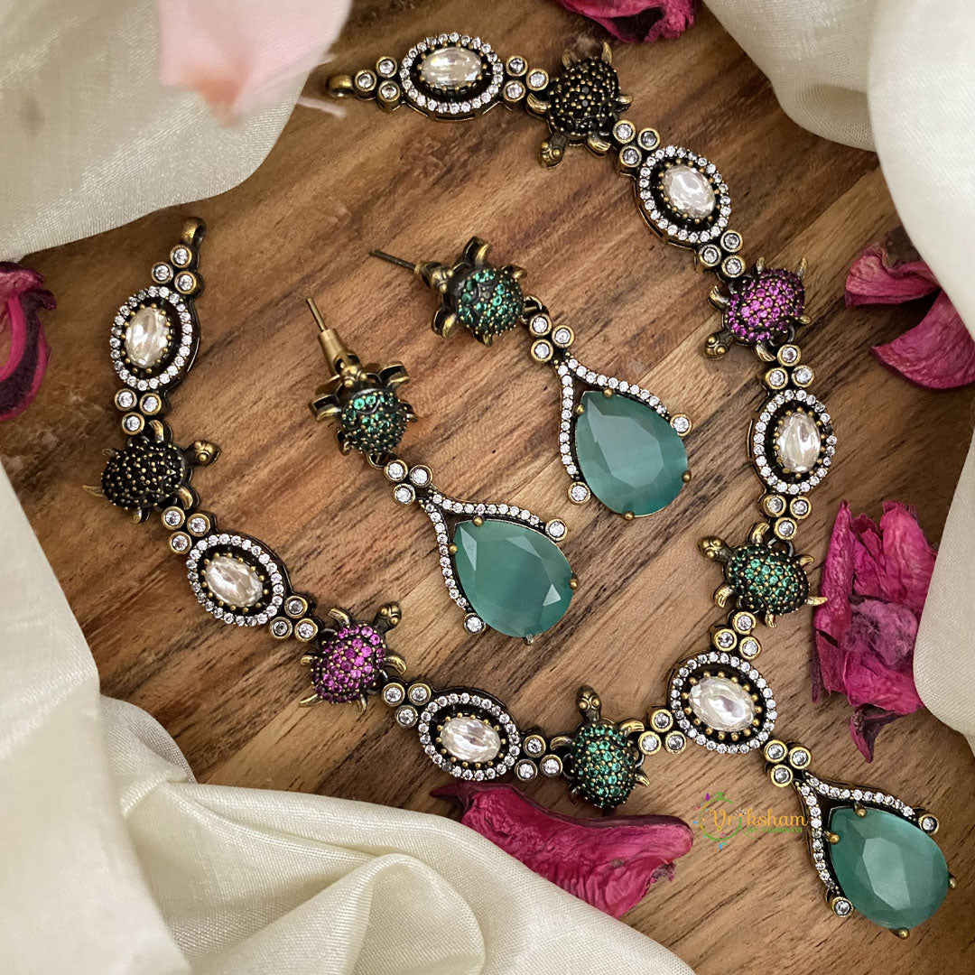 Add a touch of elegance to your outfit with our Stylish Tortoise Victorian Diamond Short Neckpiece. Featuring a beautiful aqua blue tear drop pendant, this neckpiece exudes charm and sophistication. Stand out from the crowd and elevate your style with this statement piece. Comes with matching earrings.