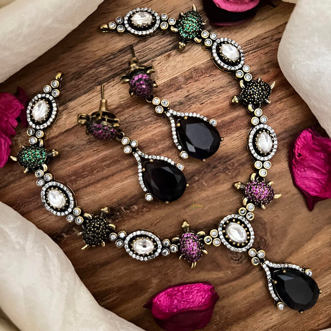 Add a touch of elegance to your outfit with our Stylish Tortoise Victorian Diamond Short Neckpiece. Featuring a beautiful purple tear drop pendant, this neckpiece exudes charm and sophistication. Stand out from the crowd and elevate your style with this statement piece. Comes with matching earrings.