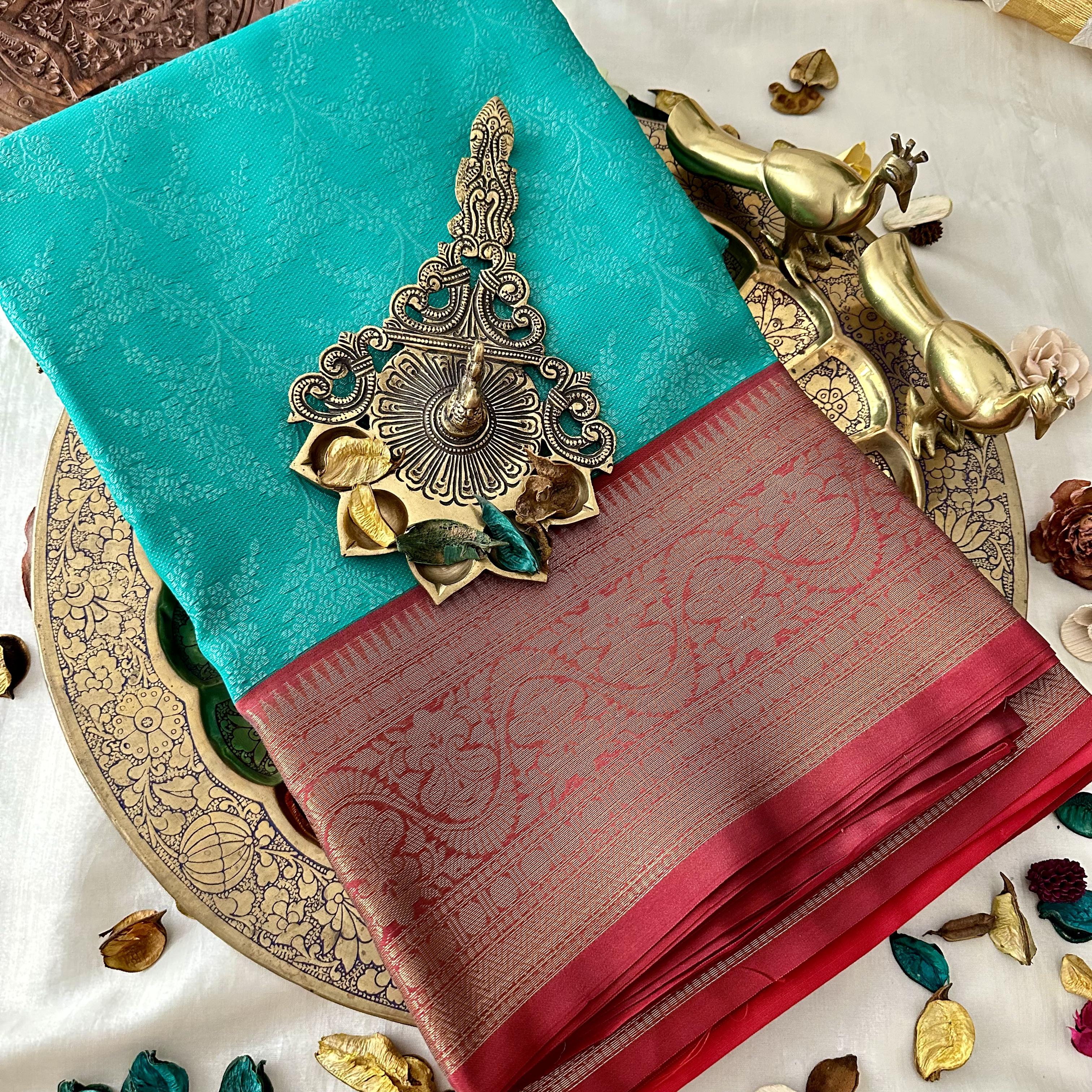 Teal Green Kora Muslin Saree with Red Border – Festive wear Kora Muslin saree manufactured in Varanasi –designer printed throughout the saree ; comes with Blouse attached.
