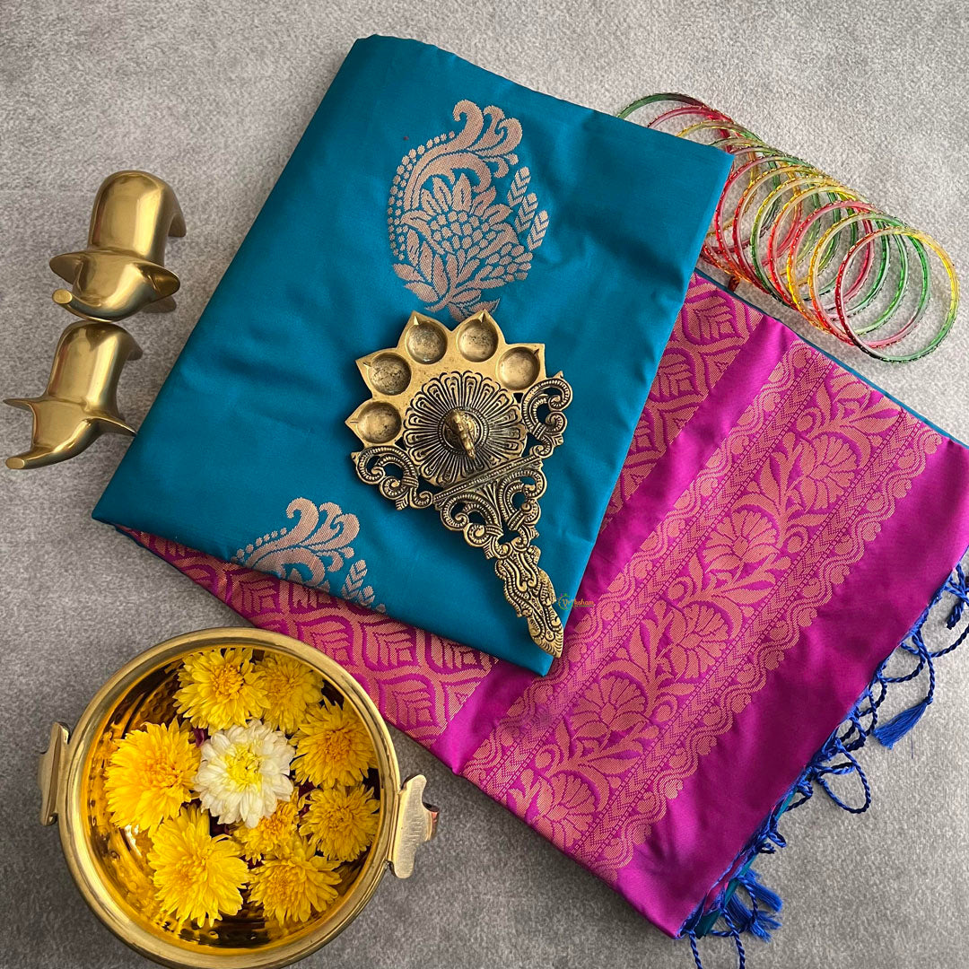 Indulge in luxury with our Teal Soft Silk Saree. The delicate fabric drapes beautifully, with a hot pink pallu and copper zari work adorning the entire saree. The delicate tassels add a touch of elegance. Elevate your style with this exclusive piece.